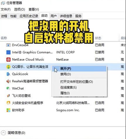 右键桌面下方,打开“任务管理器”,选择列表的“启动”项,把平时没有用的开机自启软件都禁用。