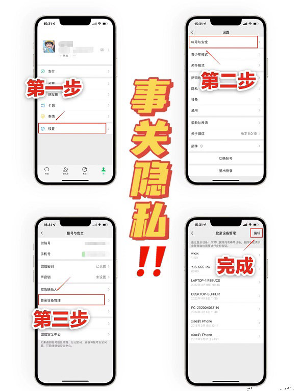在微信设置中,点击进入【账号与安全】-【登录设备管理】,进入后可以看到姐妹们最近登录微信的设备名称,赶紧将不常用的设备给删除掉,不能让他人窥探到我们的隐私!