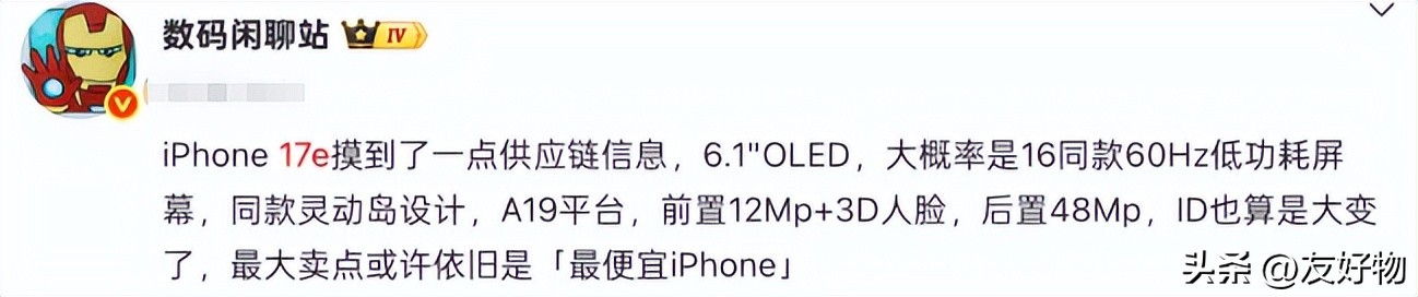 近日,有消息称:继iPhone16e之后,苹果17系列上也将推出iPhone17e机型。但它搭载了iPhone16同款60Hz低功耗屏幕,没有像iPhone17那样用上极为先进的120Hz。其他刀法也和16e一模一样,靠着砍A19处理器核心来维持等级尊严。当然卖点也依旧跟16e一样,号称最便宜的苹果手机。