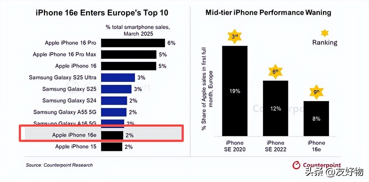 所以啊,果子们也是真搞不明白了,一心做高端的苹果怎么就非要跟着廉价机型过不去了!一方面嘛,之前的iPhone16e让苹果尝到了甜头。别看这款被打上了“智商税”标签的机型,在国内口碑稀烂,但是在美国16e可是占到了总销量了11%。