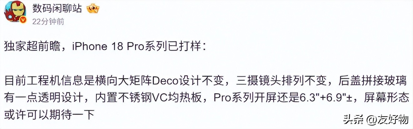 据博主@数码闲聊站 爆料:“iPhone 18 Pro系列手机已经开始打样,目前工程机在大体设计上保持不变,维持横向大矩阵后置镜头模组,三摄镜头排列也与iPhone17 Pro系列一样,后盖拼接玻璃有一点透明设计,内置不锈钢VC均热板,Pro系列开屏还是6.3"、6.9"左右,屏幕形态或许可以期待一下”。
